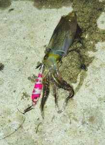 1.8寸の重めのエギとスッテの組み合わせで狙っています。スッテに抱いてくるイカを釣っていく釣り方が有効でした。