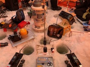 大型テントでしたが4人で電動リール2台ずつ魚探3台出すと中々な光景になりました💦