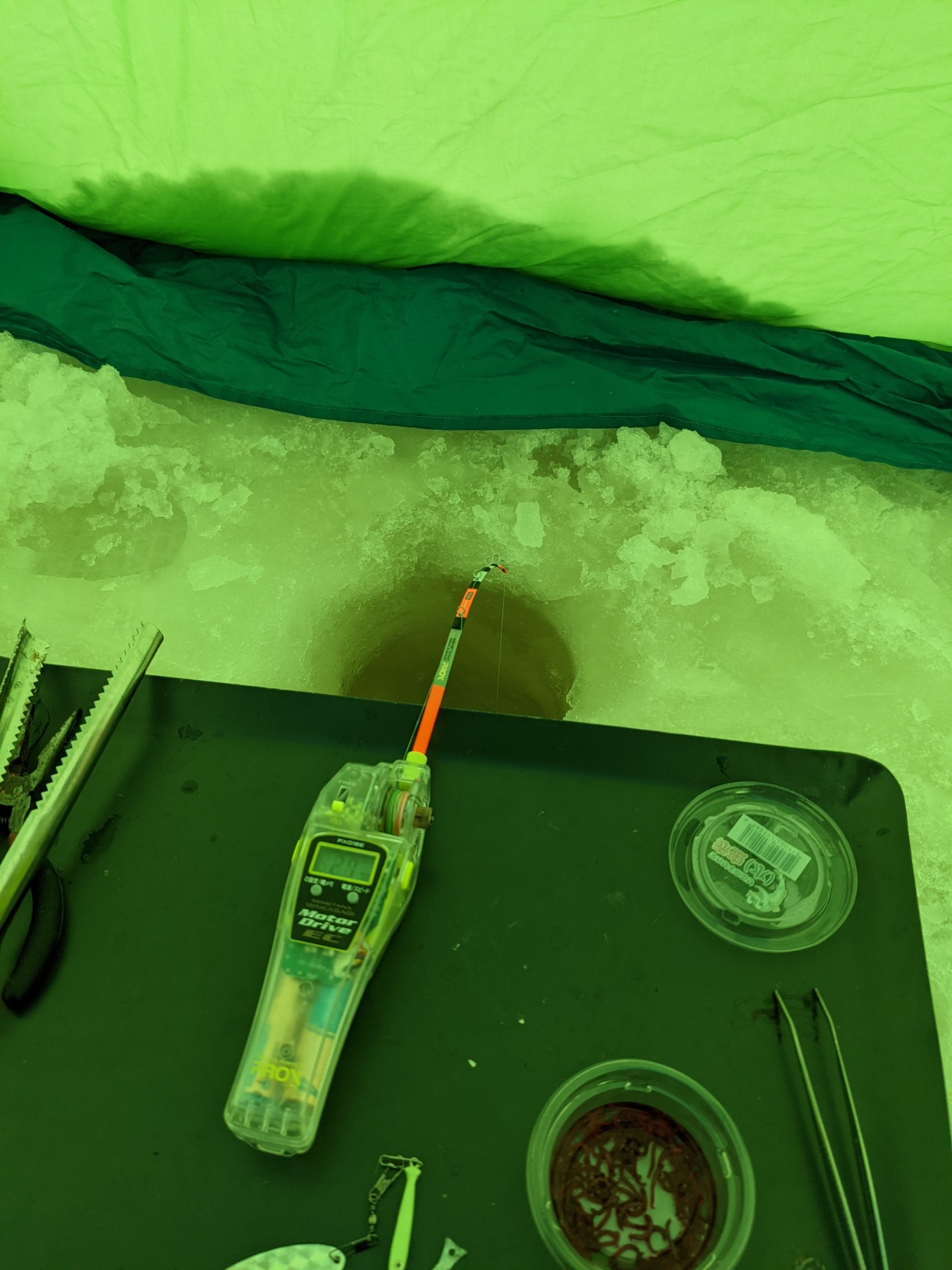 棚は2m位でエサは赤虫に仕掛けは1.0号の5本針を使いました。
