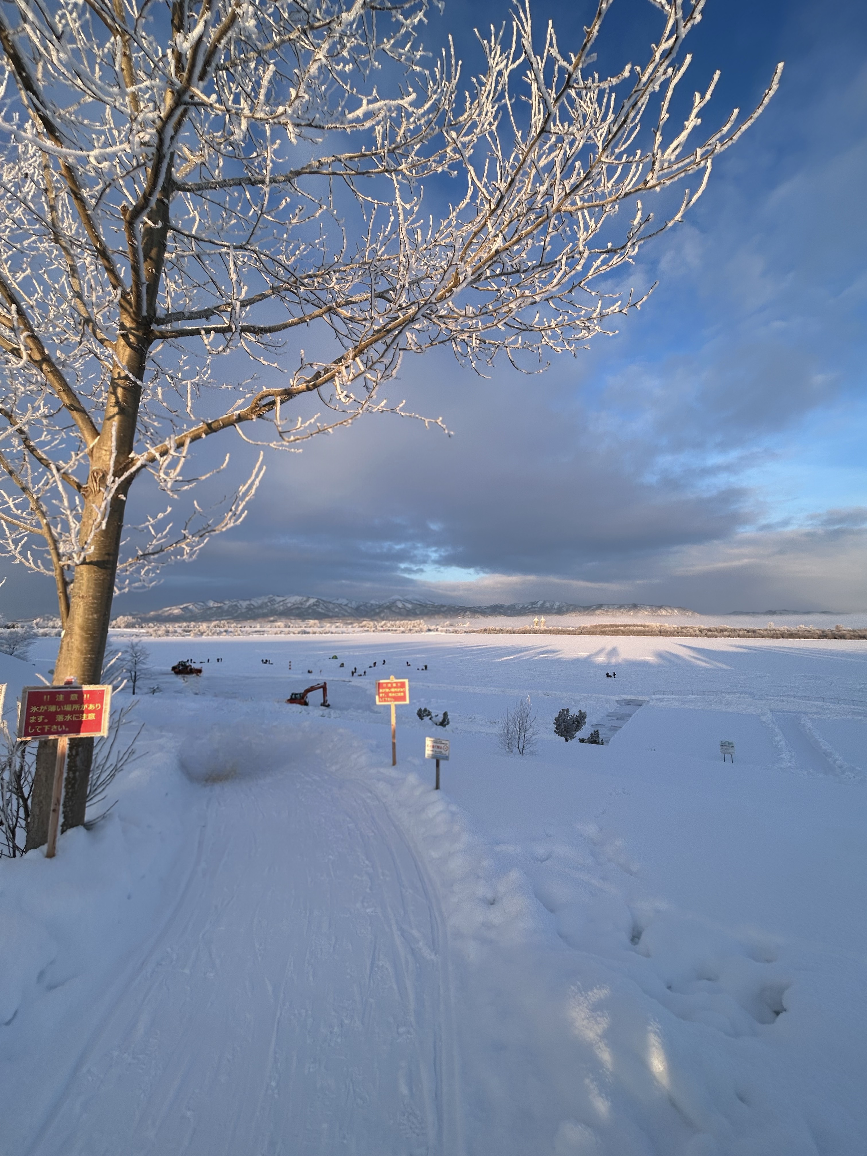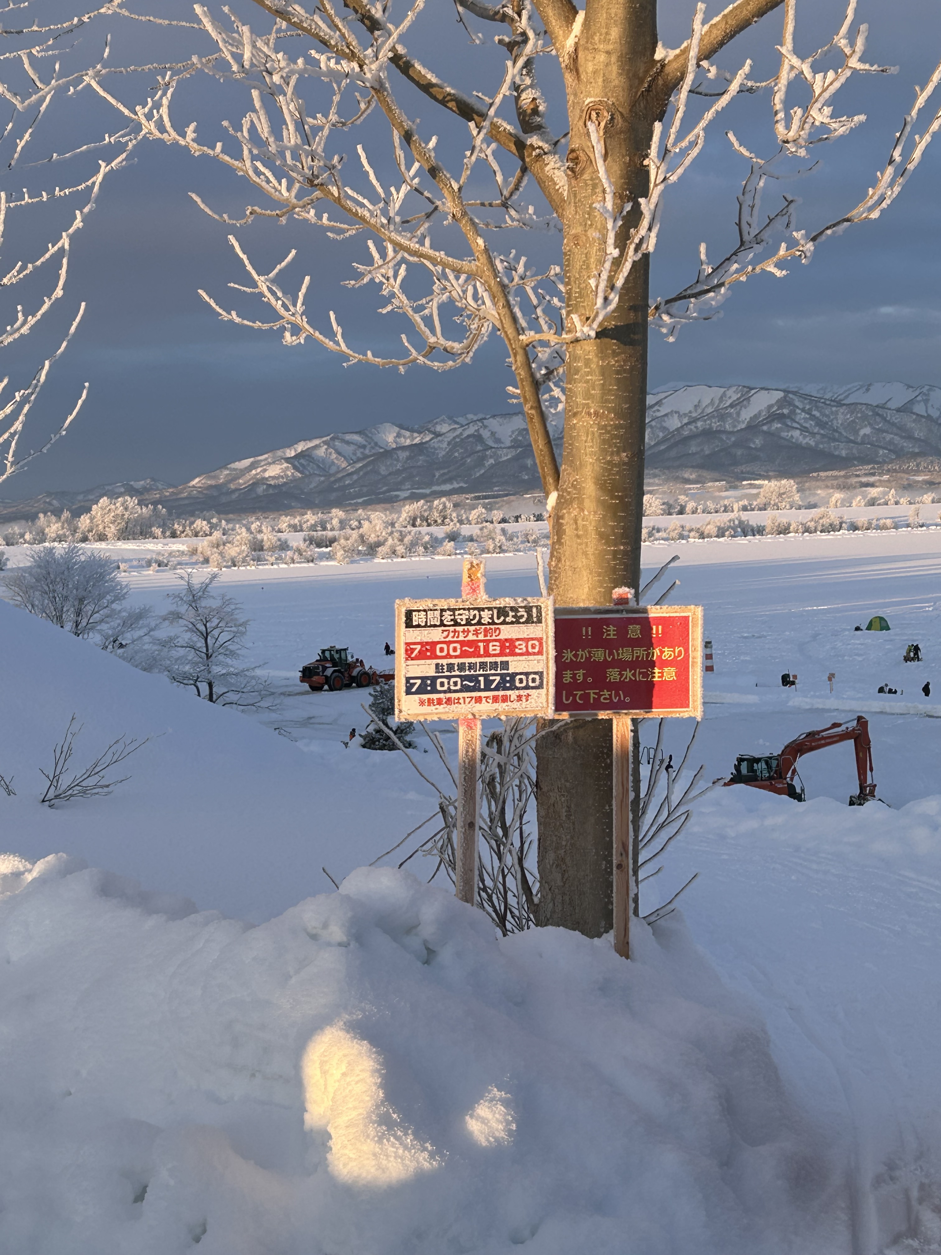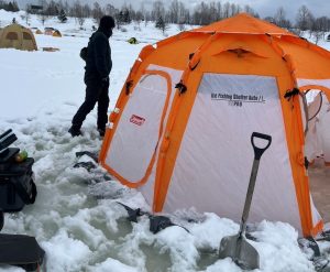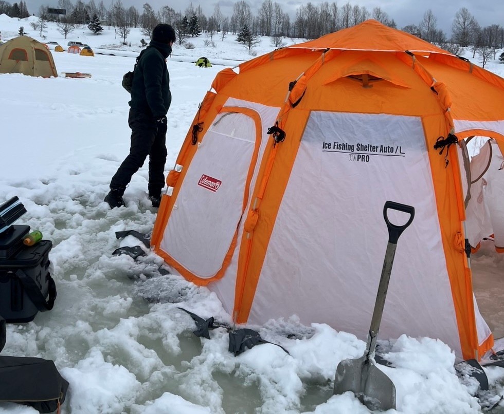 準備を終え氷上までの坂を降り、氷上へ乗ると表面の雪が溶けている為、ズボベチャでした。 スパイク長靴orかんじきがあると歩きやすい状況!!