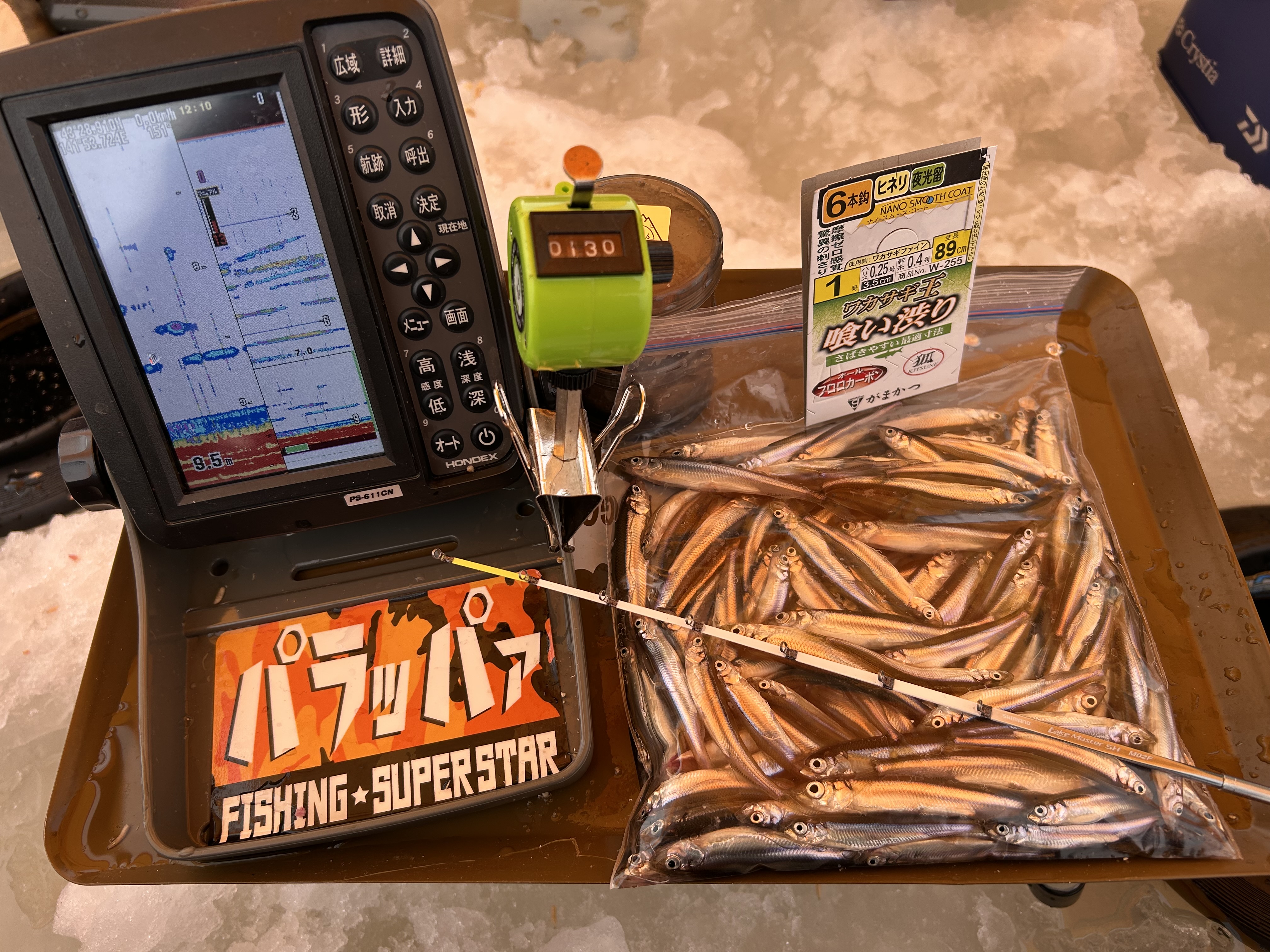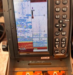 12m~13m付近はなかなか魚探の反応が無くと底質の硬さもあり、ワカサギを見つけられず、思い切って10m以下の水深を検索すると今日一番のポイントを見つけたので今日はここで釣りをスタート!!