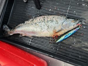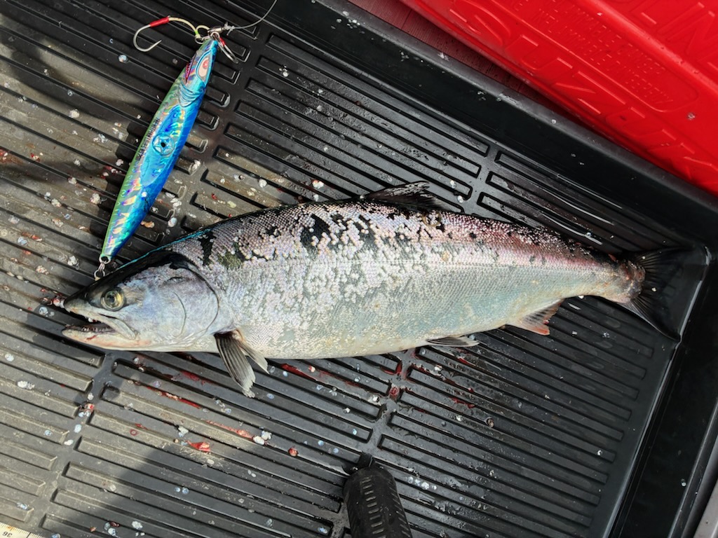 この日の山沖は、潮が悪く、サクラマスの釣果厳しかったのですが、ジギング名人のO本様はヒットマンジグを使用し、見事に綺麗なサクラマスを釣り上げられました😃