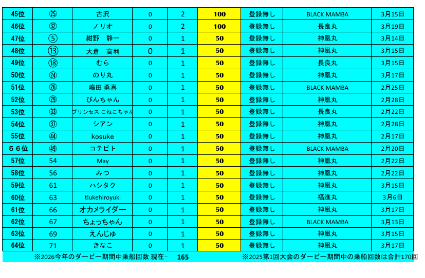 ↓①女子高生様は本日で乗船回数は15回と、ダービー参加者様のなかで最多。